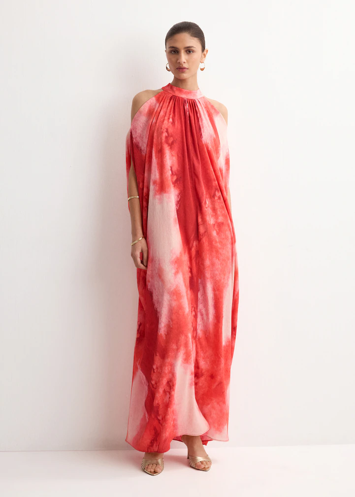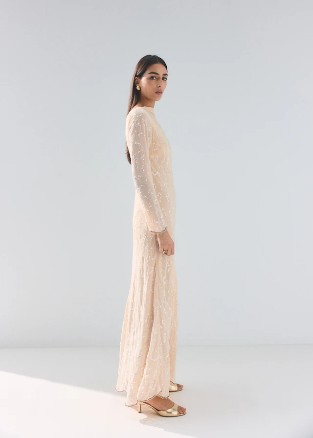 Soft drama, handled well. The open-shoulder line feels modern, while the flowing length keeps it evening-appropriate and refined.
